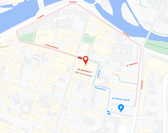Nasz obiekt znajduje się w ścisłym centrum miasta, naszym gościom proponujemy parking dozorowany niedaleko od naszego obiektu, zaledwie 2-3 min pieszo, przy pl. Nowy Targ 29. Oferujemy preferencyjną cenę parkingu dla gości konferencyjnych. Aby cena obowiązywała konieczne jest zakodowanie biletu parkingowego w recepcji hotelu. Zakodowany bilet parkingowy jest ważny do godziny 13.00 w dniu wyjazdu. Odległość od Dworca Głównego PKP to zaledwie 7-9 min jazdy samochodem, a na lotnisko dostaną się Państwo w ciągu niecałych 30 min.